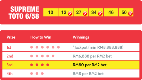 - Jackpot is 65% of the Prize Pool plus upfront RM8,888,888 and any snowballed amount brought forward from previous draws.